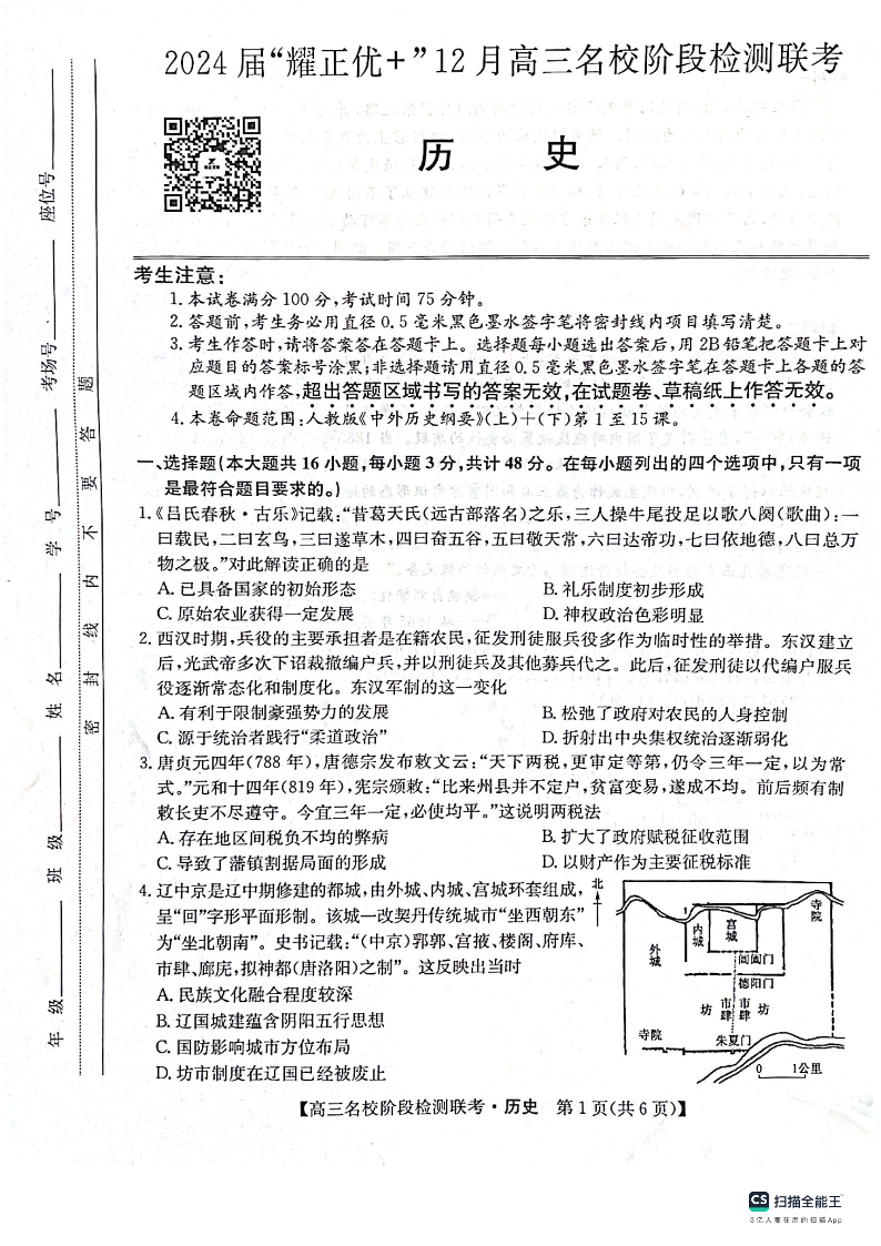 2024届“耀正优+”12月高三名校阶段检测联考 历史