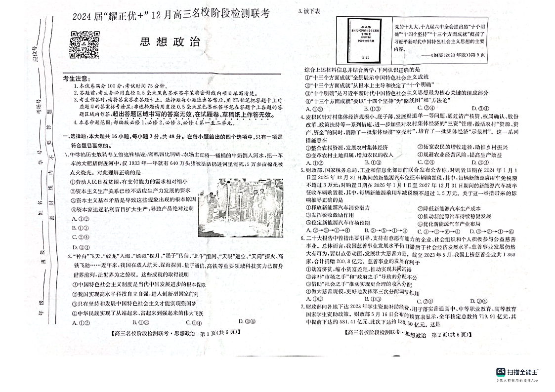 2024届“耀正优+”12月高三名校阶段检测联考 政治