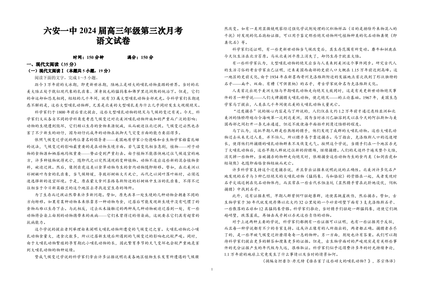 安徽省六安第一中学2023-2024学年高三上学期第三次月考+语文