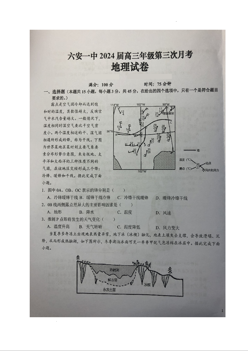 安徽省六安第一中学2023-2024学年高三上学期第三次月考+地理