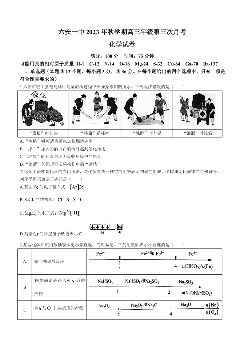 安徽省六安第一中学2023-2024学年高三上学期第三次月考+化学