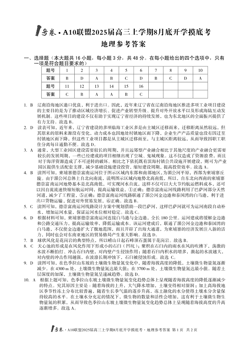安徽省1号卷A10联盟2025届高三上学期8月开学摸底考试+地理答案