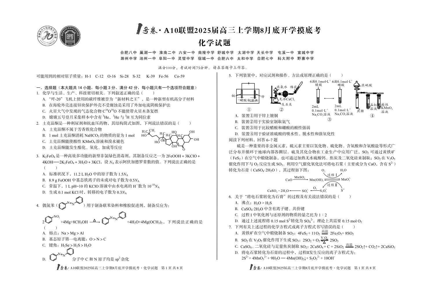 安徽省1号卷A10联盟2025届高三上学期8月开学摸底考试+化学