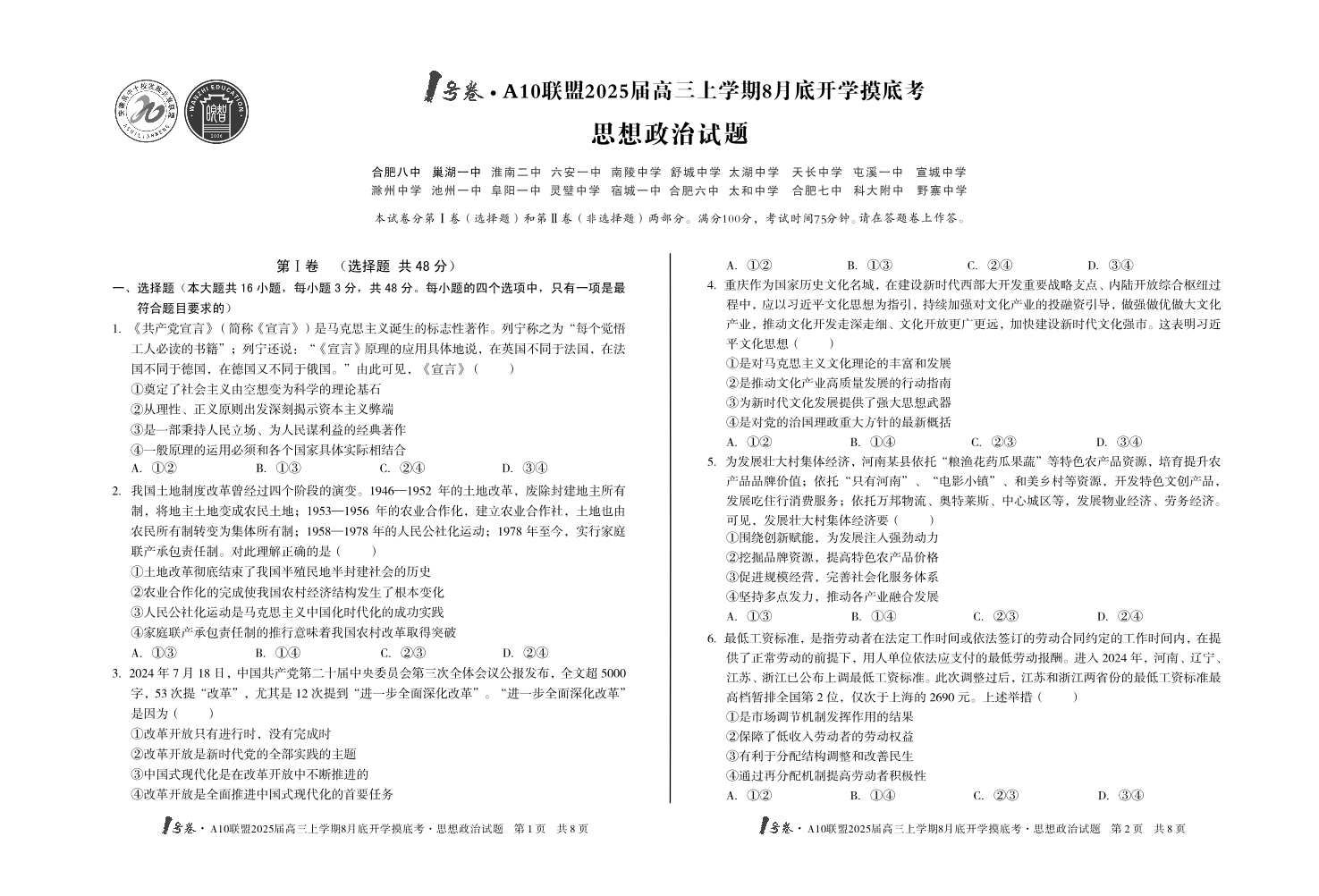 安徽省1号卷A10联盟2025届高三上学期8月开学摸底考试+思想政治