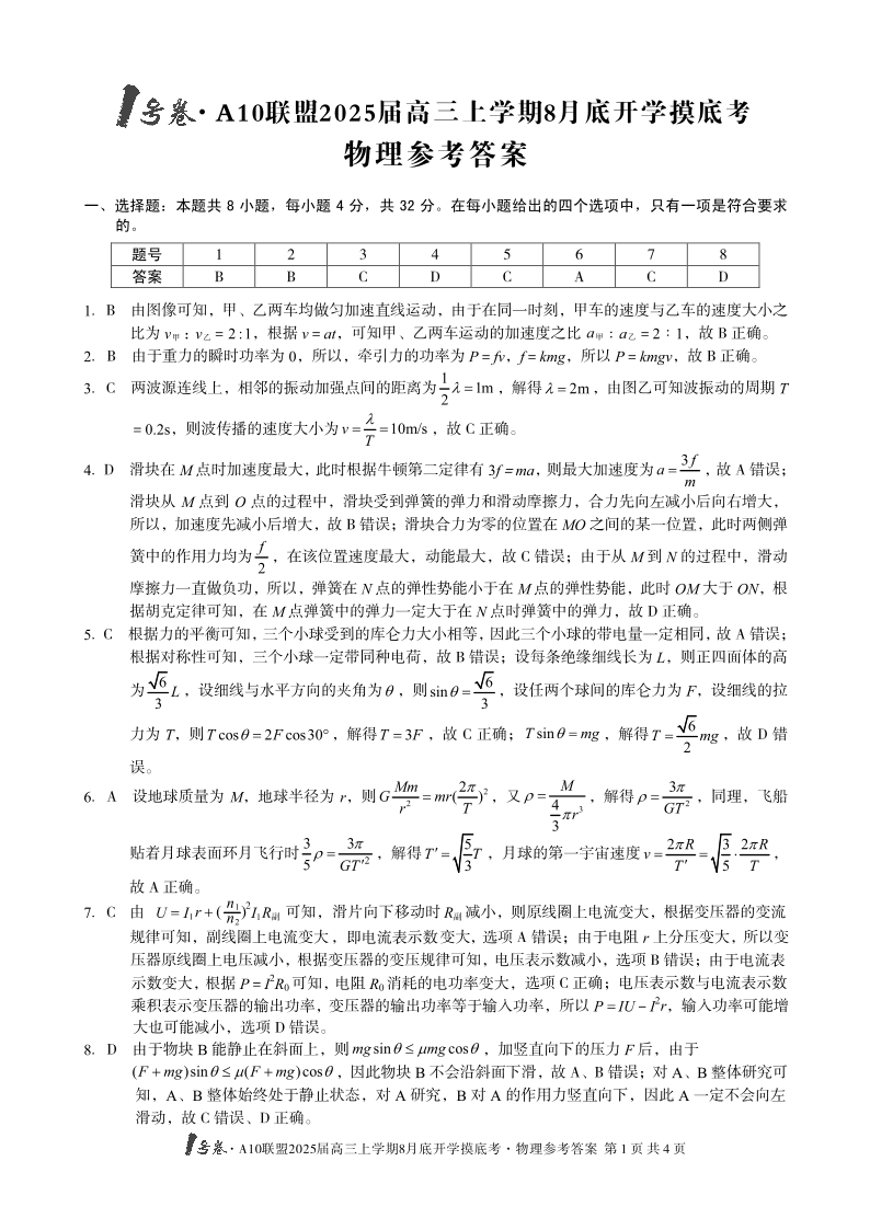 安徽省1号卷A10联盟2025届高三上学期8月开学摸底考试+物理答案