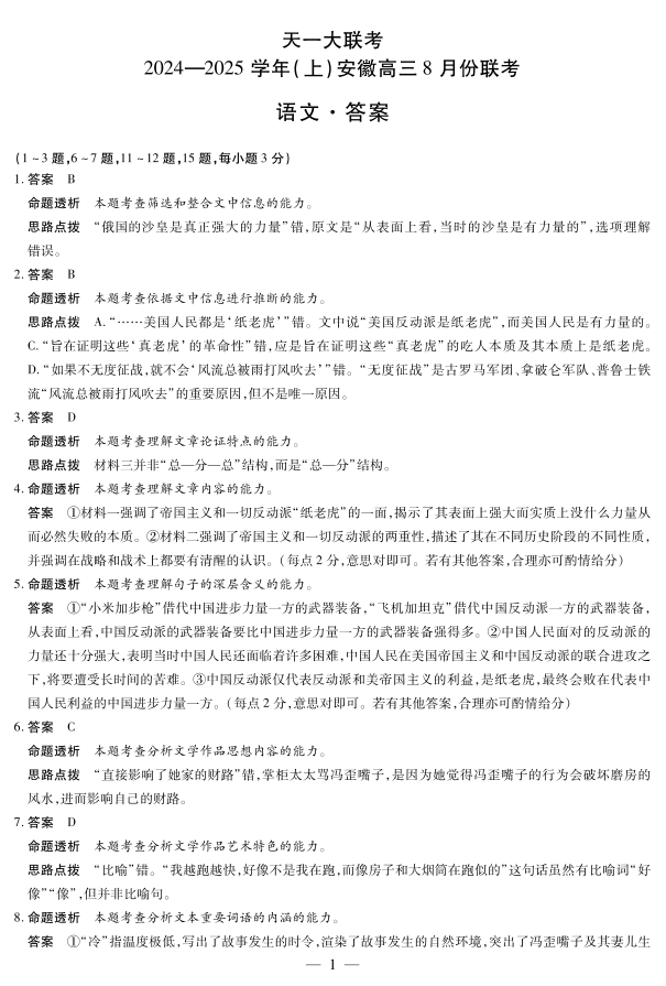 天一大联考2024-2025学年(上)安徽高三8月份联考+语文答案
