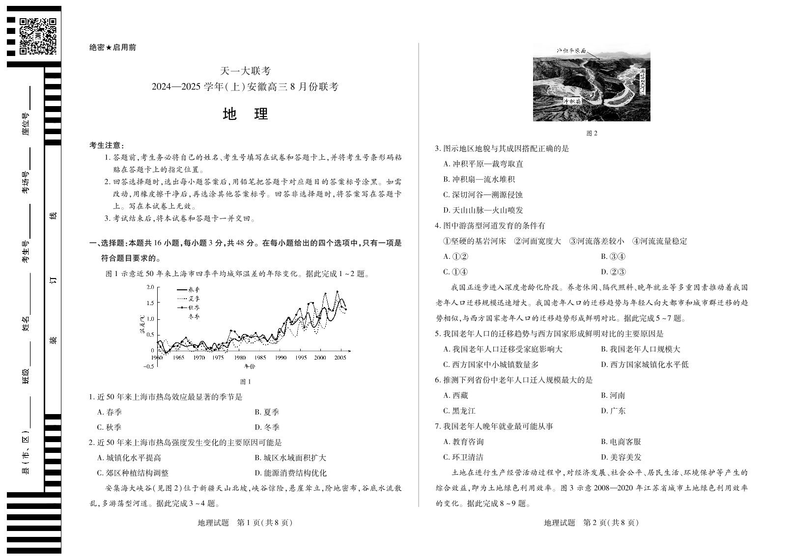 天一大联考2024-2025学年(上)安徽高三8月份联考+地理