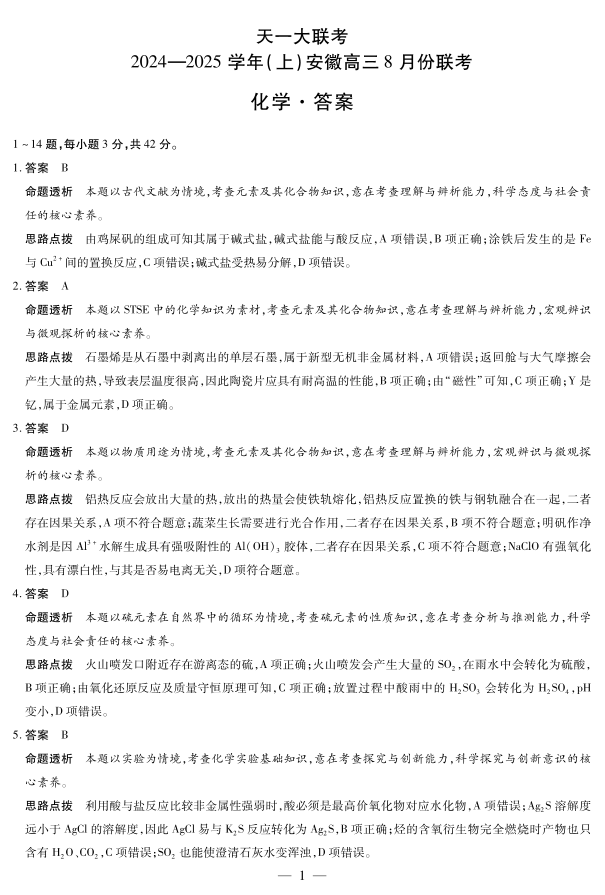 天一大联考2024-2025学年(上)安徽高三8月份联考+化学答案