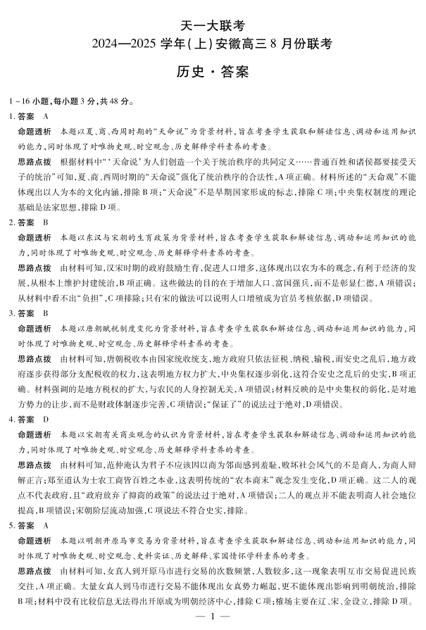 天一大联考2024-2025学年(上)安徽高三8月份联考+历史答案