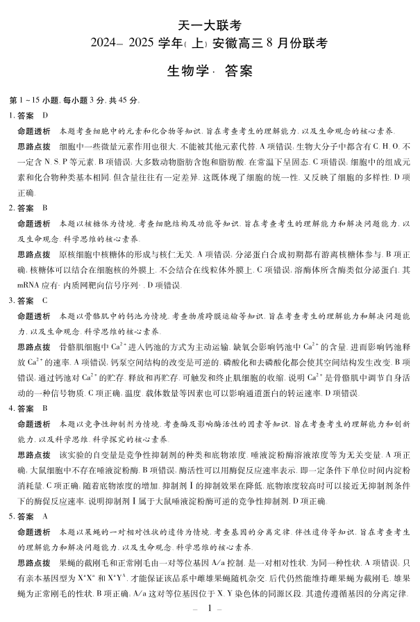 天一大联考2024-2025学年(上)安徽高三8月份联考+生物答案