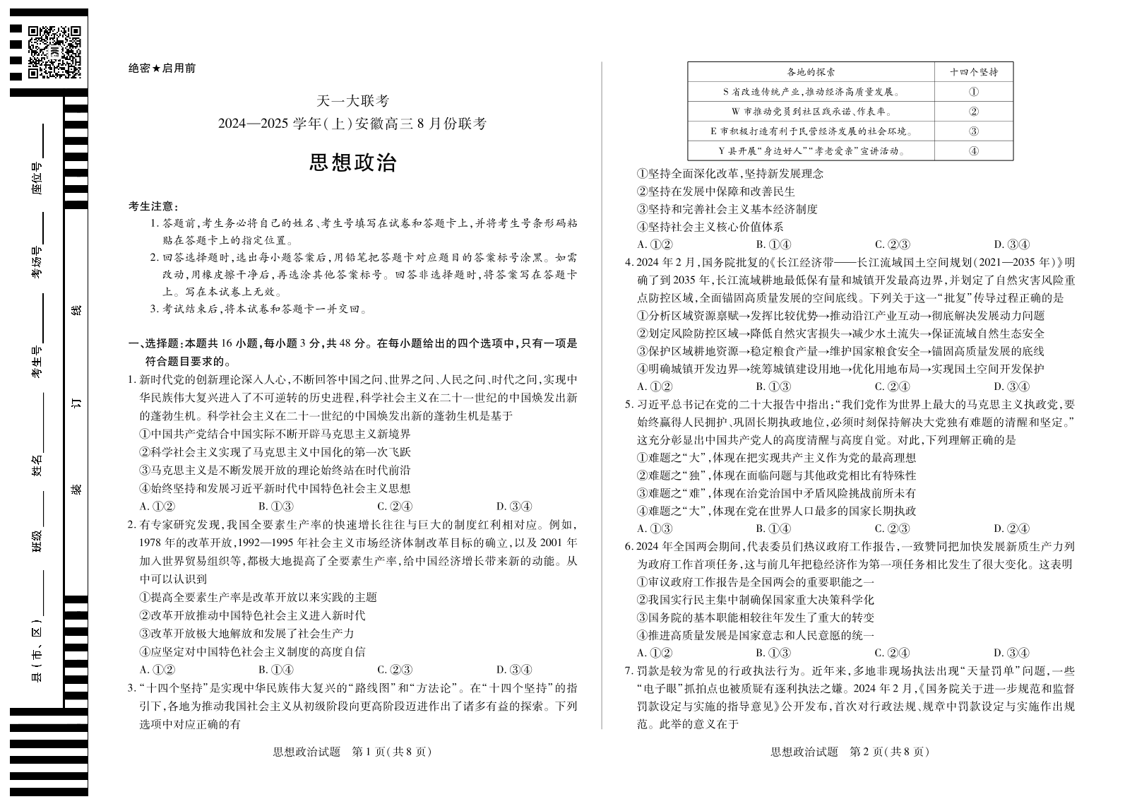 天一大联考2024-2025学年(上)安徽高三8月份联考+政治