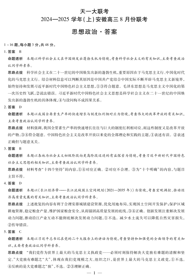 天一大联考2024-2025学年(上)安徽高三8月份联考+政治答案
