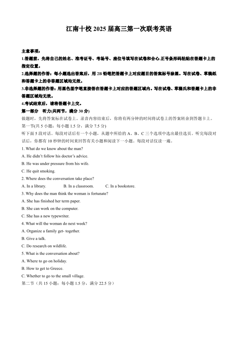 安徽省江淮十校2025届高三年级第一次联考+英语