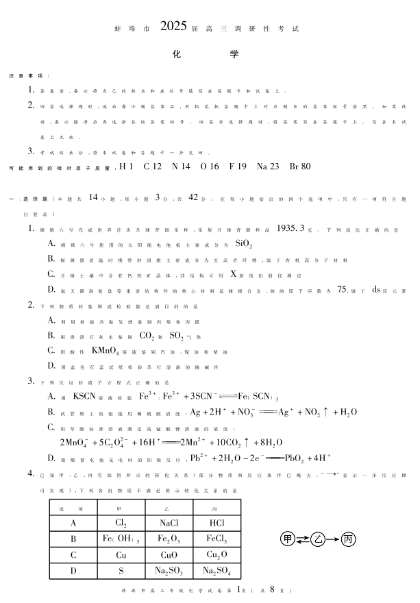 安徽省蚌埠市2025届高三年级上学期8月调研性考试+化学
