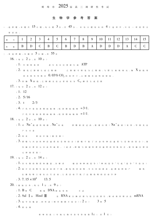 安徽省蚌埠市2025届高三年级上学期8月调研性考试+生物答案