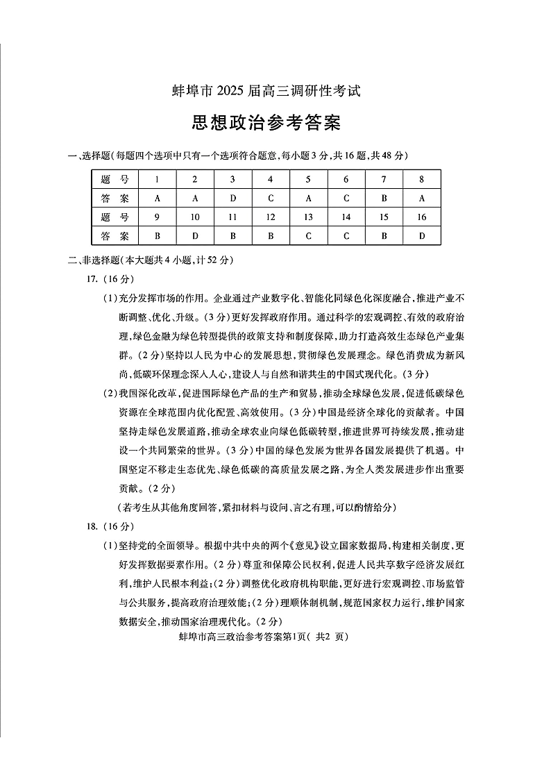安徽省蚌埠市2025届高三年级上学期8月调研性考试+政治答案