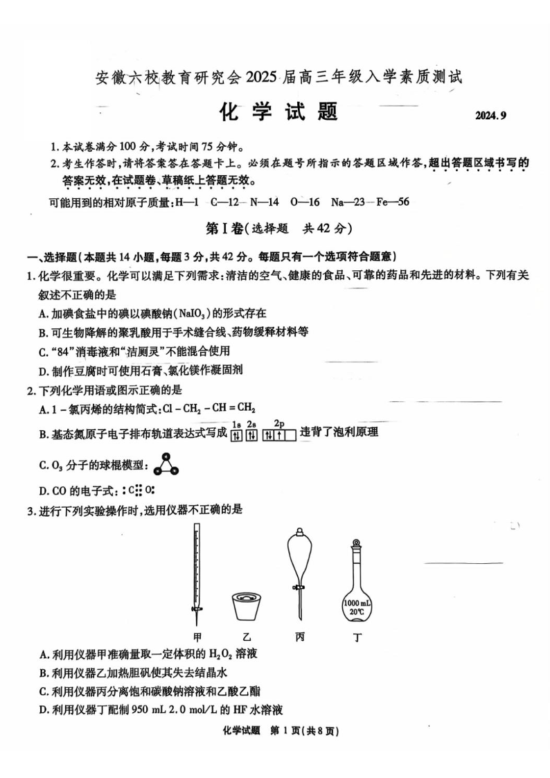 安徽省六校教育研究会2025届高三年级入学素质测试+化学