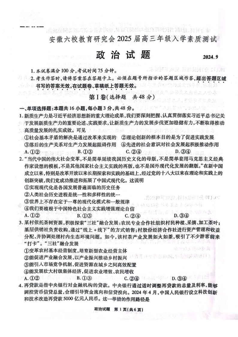 安徽省六校教育研究会2025届高三年级入学素质测试+政治