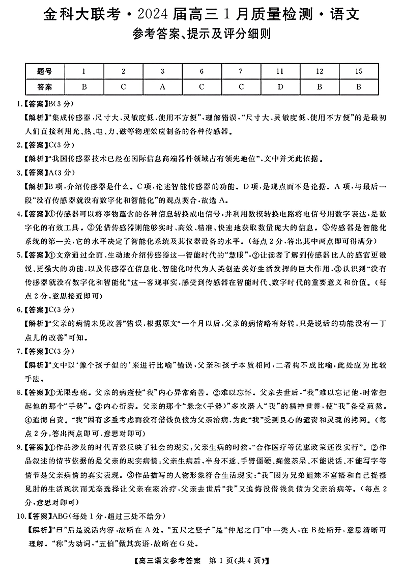 河北省金科大联考2023-2024学年高三上学期1月质量检测 语文答案