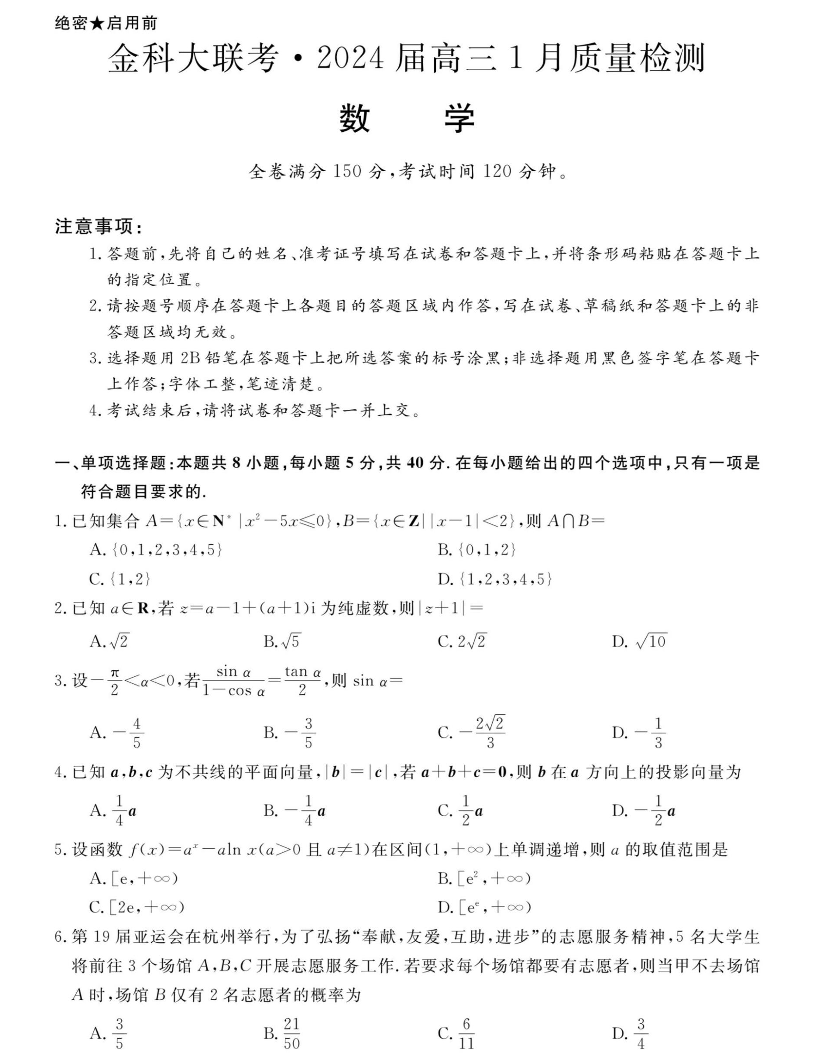 河北省金科大联考2023-2024学年高三上学期1月质量检测 数学