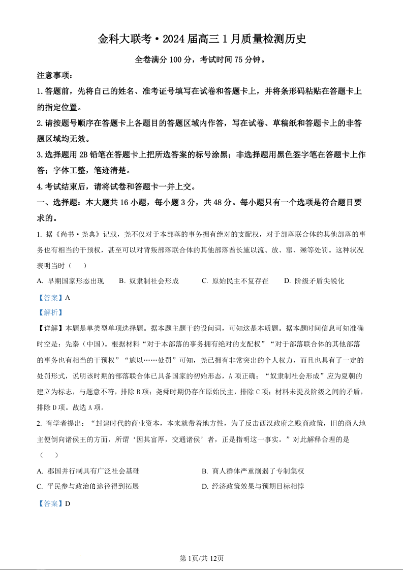 河北省金科大联考2023-2024学年高三上学期1月质量检测 历史答案