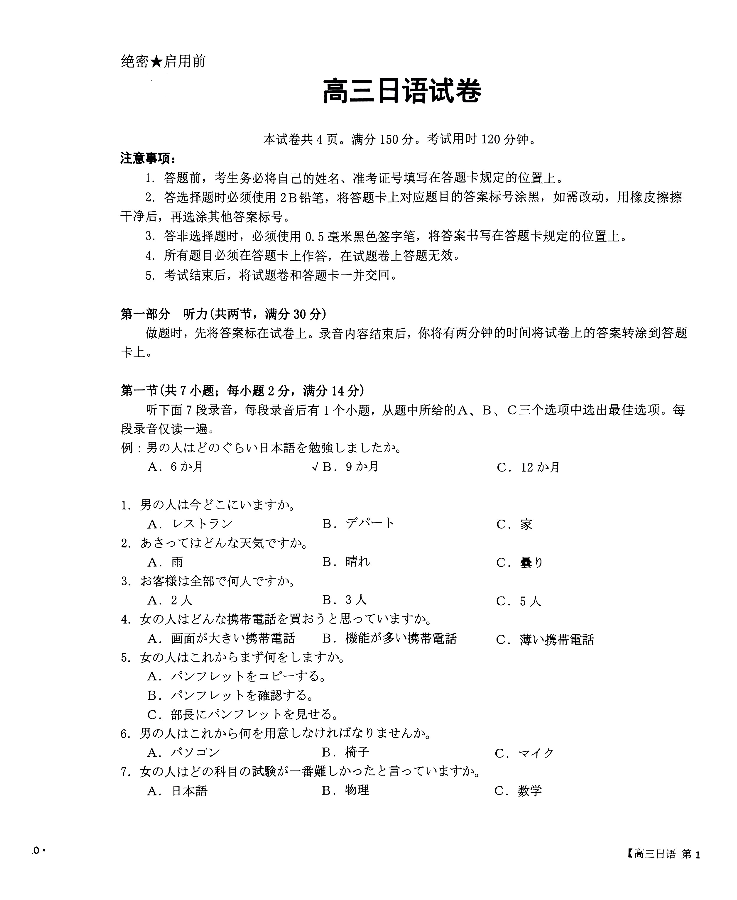 河北省强基名校联盟2023-2024学年高三年级下学期开学联考 日语