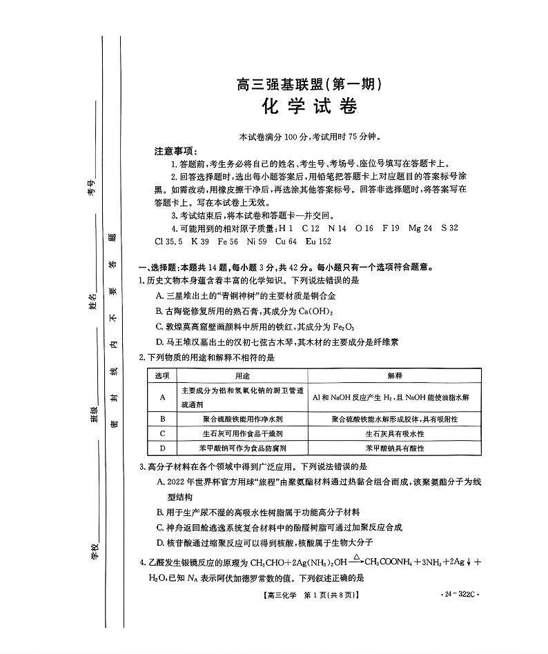 河北省强基名校联盟2023-2024学年高三年级下学期开学联考 化学