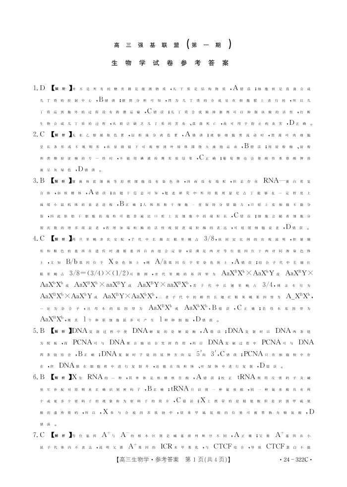 河北省强基名校联盟2023-2024学年高三年级下学期开学联考 生物答案