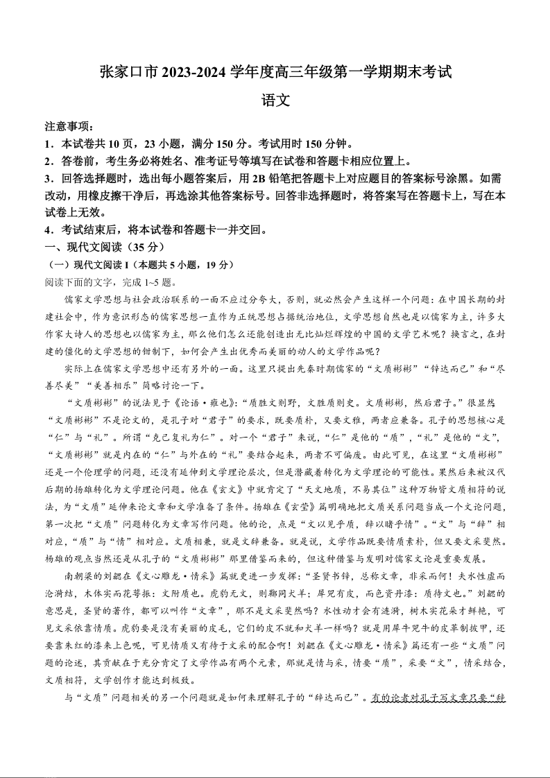 河北省张家口市2023-2024学年高三上学期1月期末考试 语文