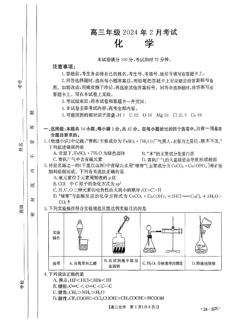 河北省部分重点高中2023-2024学年高三上学期期末考试 化学