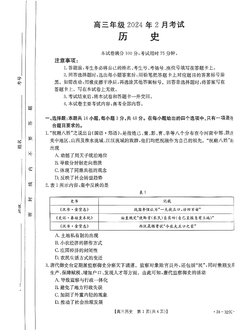 河北省部分重点高中2023-2024学年高三上学期期末考试 历史