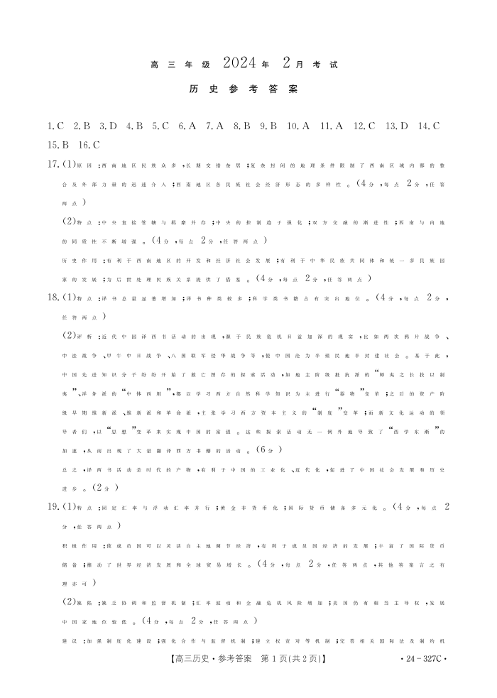 河北省部分重点高中2023-2024学年高三上学期期末考试 历史答案