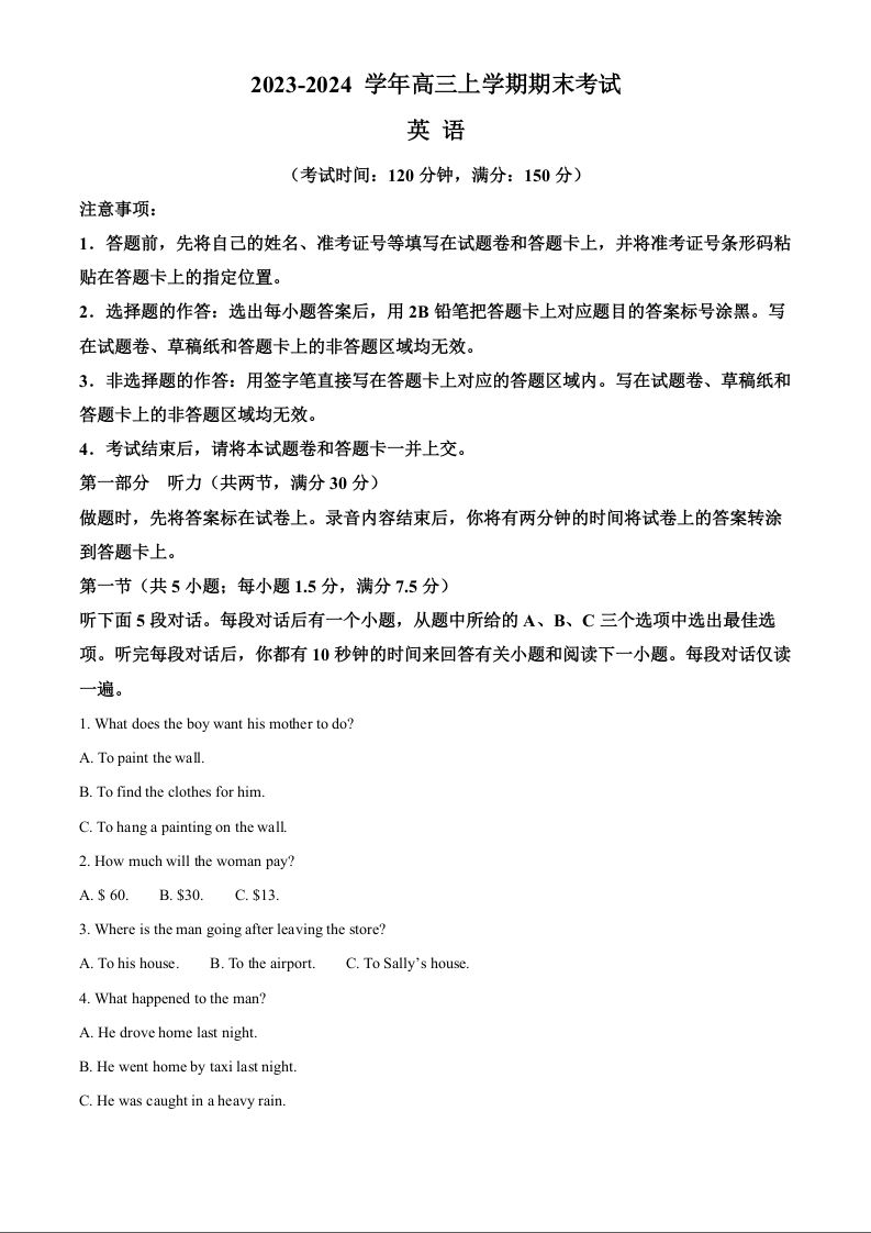 河北省保定市部分高中2023-2024学年高三上学期1月期末考试 英语