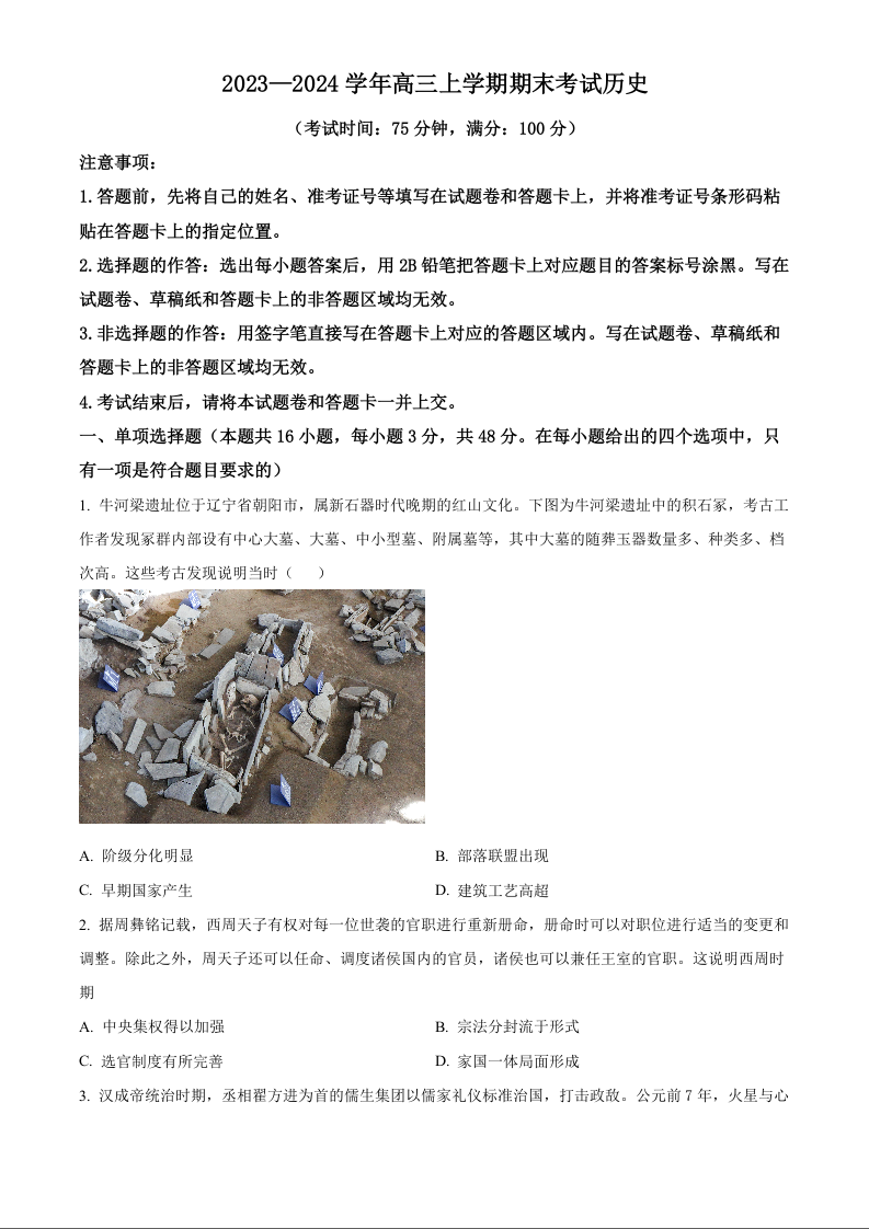河北省保定市部分高中2023-2024学年高三上学期1月期末考试 历史