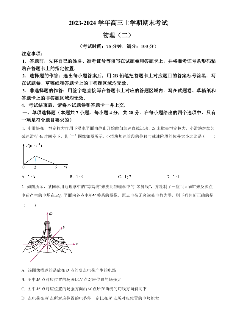 河北省保定市部分高中2023-2024学年高三上学期1月期末考试 物理