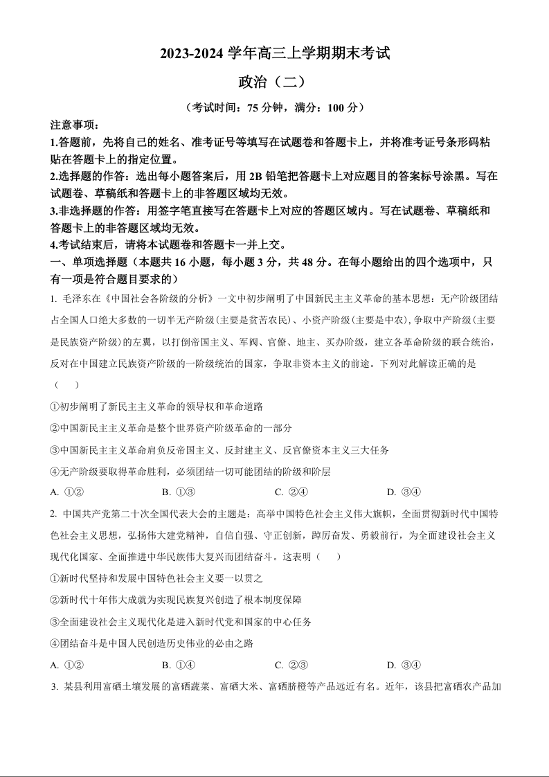 河北省保定市部分高中2023-2024学年高三上学期1月期末考试 政治