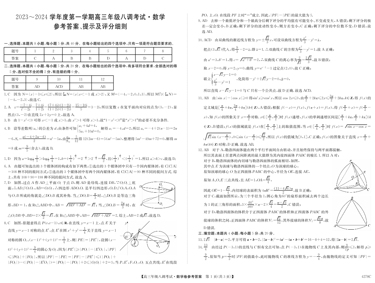 河北省邯郸市磁县第一中学2023-2024学年高三上学期八调考试 数学答案