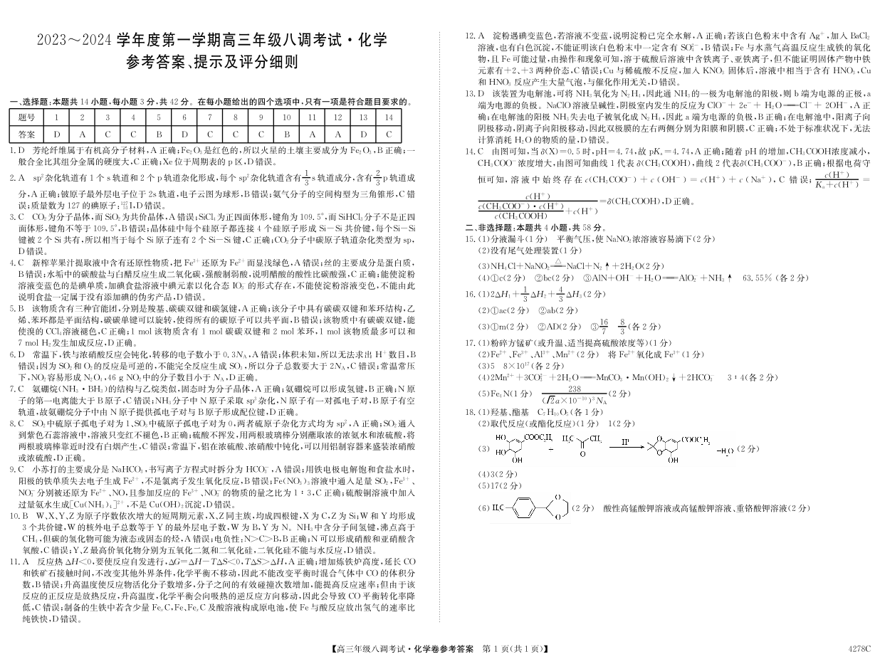 河北省邯郸市磁县第一中学2023-2024学年高三上学期八调考试 化学答案