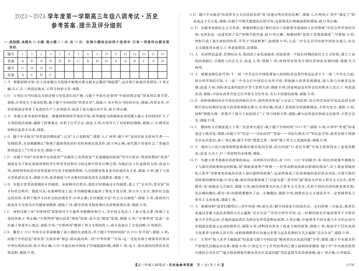 河北省邯郸市磁县第一中学2023-2024学年高三上学期八调考试 历史答案