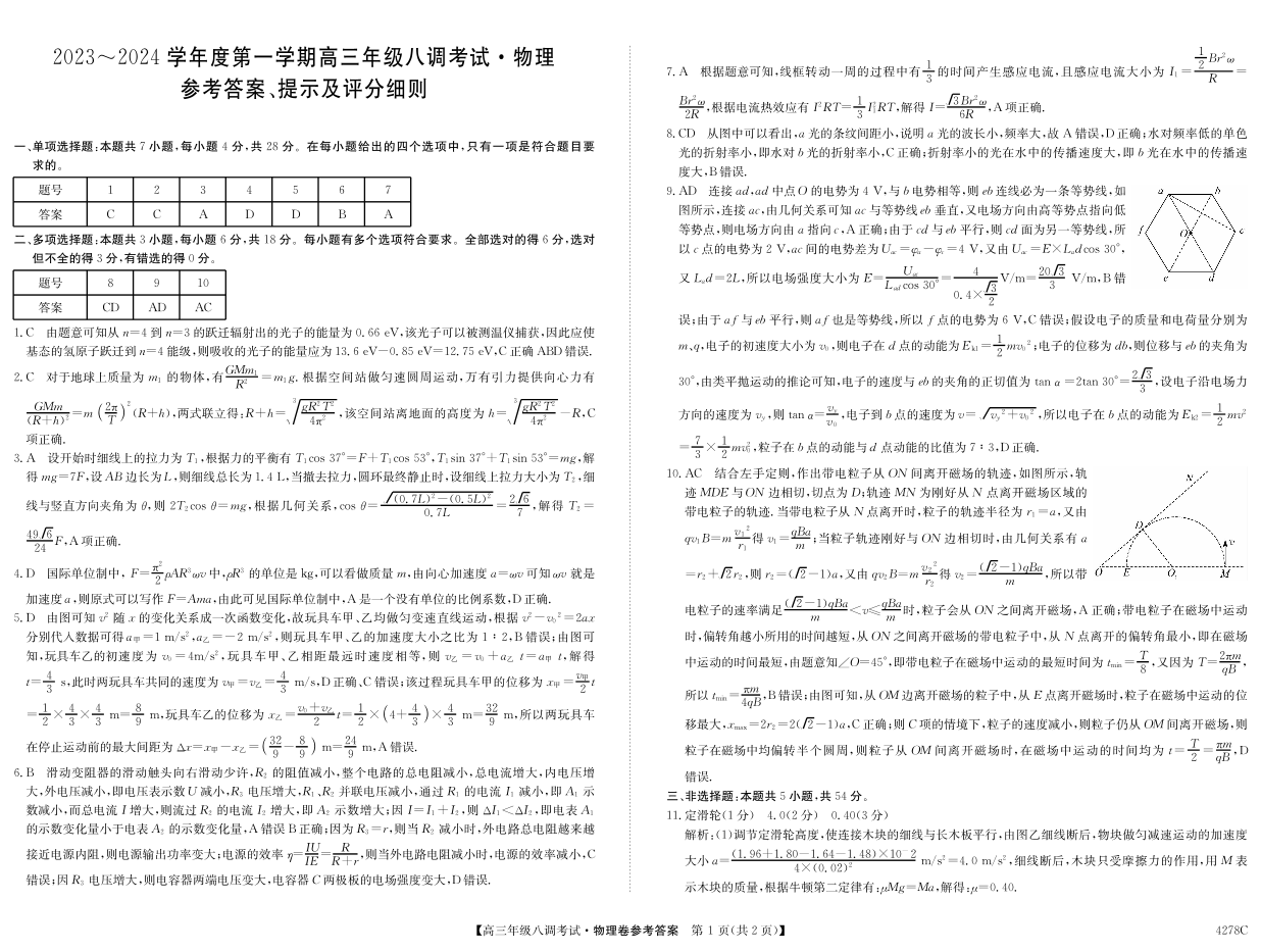 河北省邯郸市磁县第一中学2023-2024学年高三上学期八调考试 物理答案