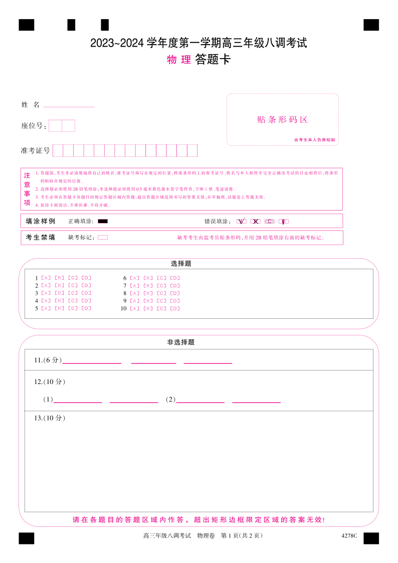 河北省邯郸市磁县第一中学2023-2024学年高三上学期八调考试 物理答题卡