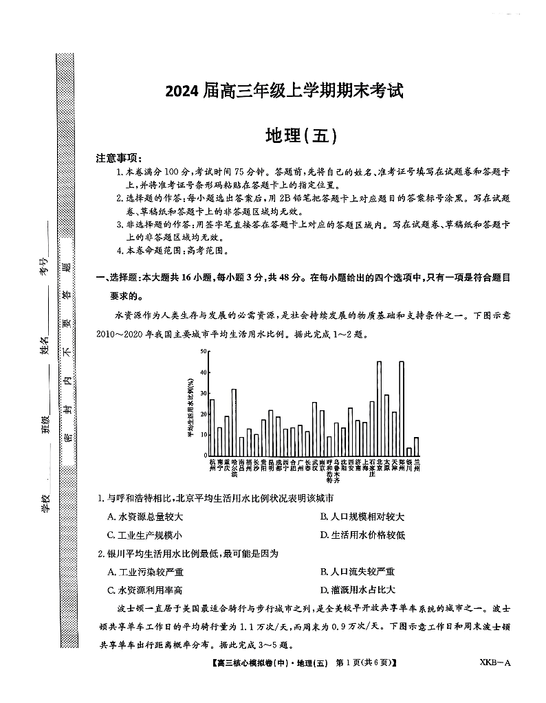 河北省唐县第一中学2023-2024学年高三上学期1月期末考试 地理