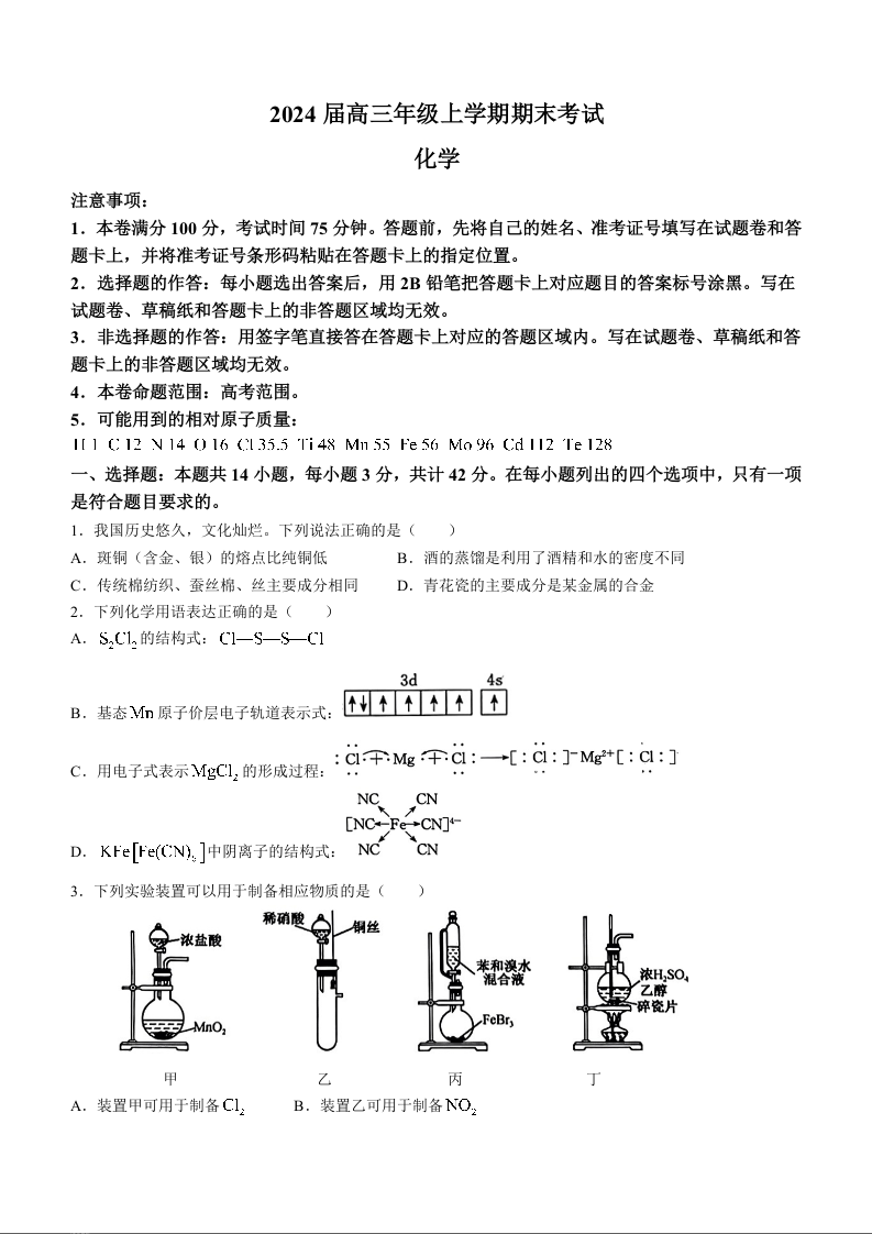 河北省唐县第一中学2023-2024学年高三上学期1月期末考试 化学