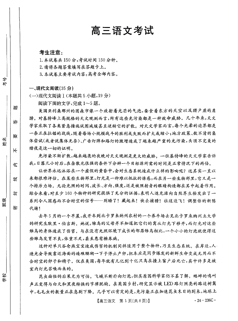 河北省保定市部分重点高中2023-2024学年高三上学期12月期末考试 语文