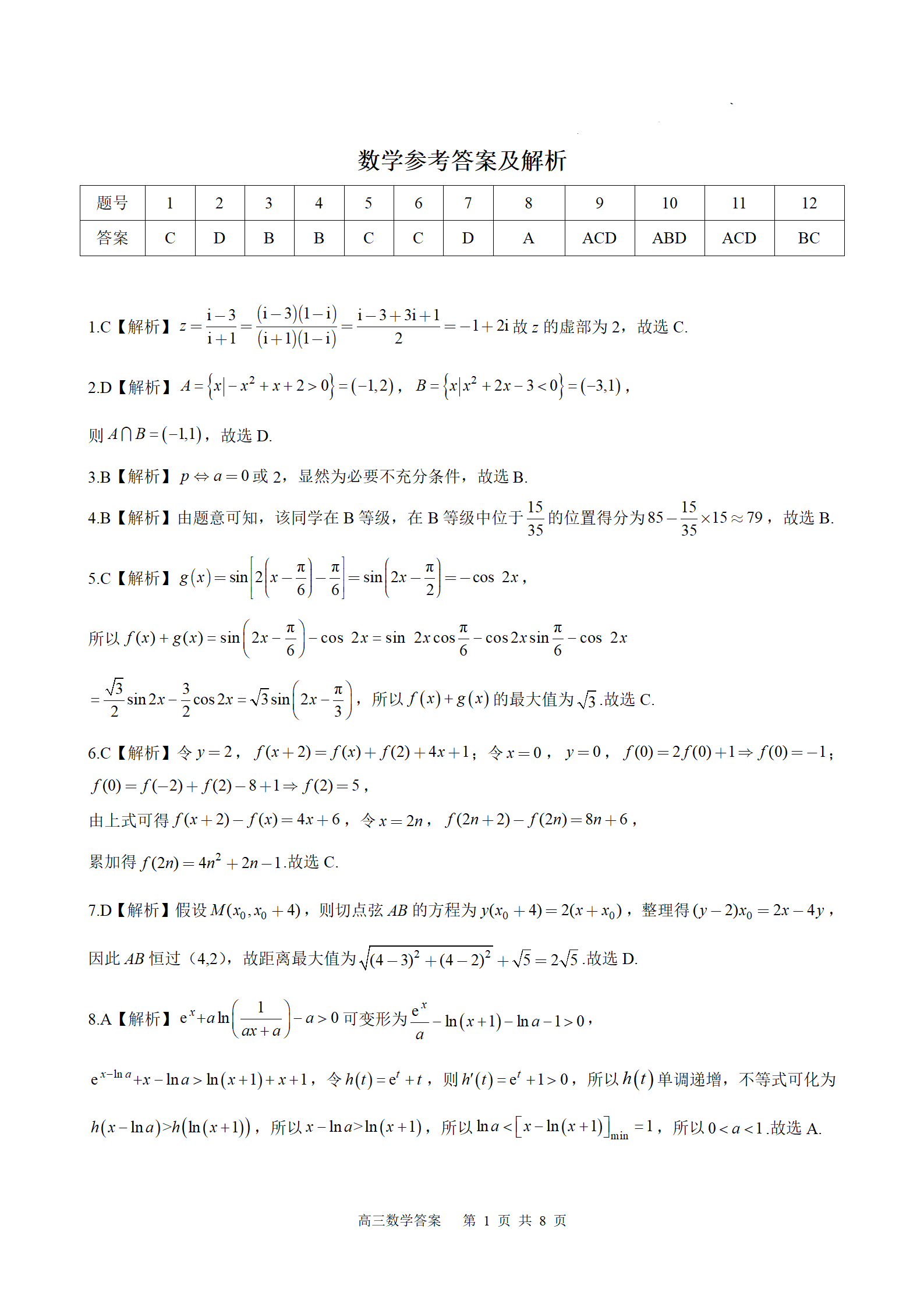 河北省保定市部分重点高中2023-2024学年高三上学期12月期末考试 数学答案