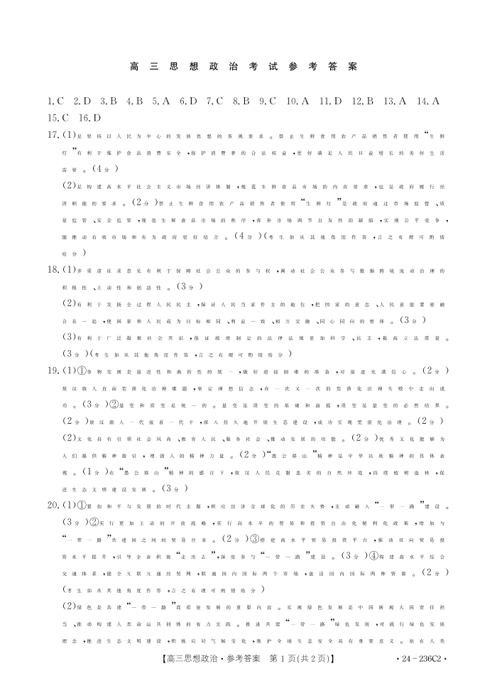 河北省保定市部分重点高中2023-2024学年高三上学期12月期末考试 政治答案