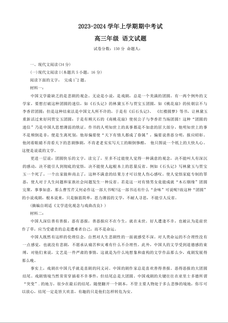河北省衡水市冀州中学2023-2024学年高三上学期期中考试 语文