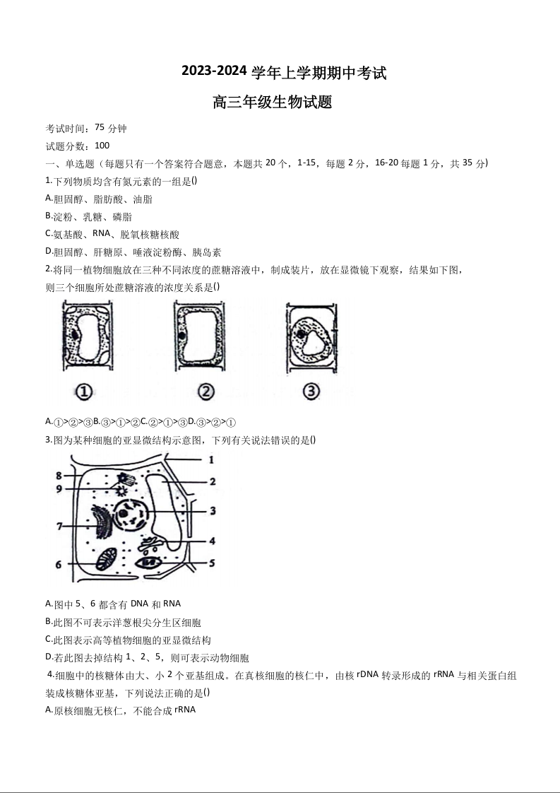 河北省衡水市冀州中学2023-2024学年高三上学期期中考试 生物