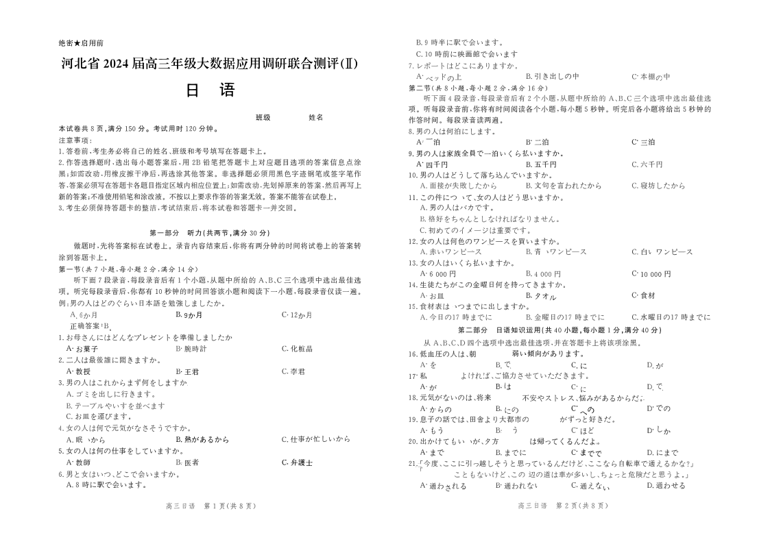 河北省2023-2024学年高三上学期大数据应用调研联合测评(Ⅱ)日语