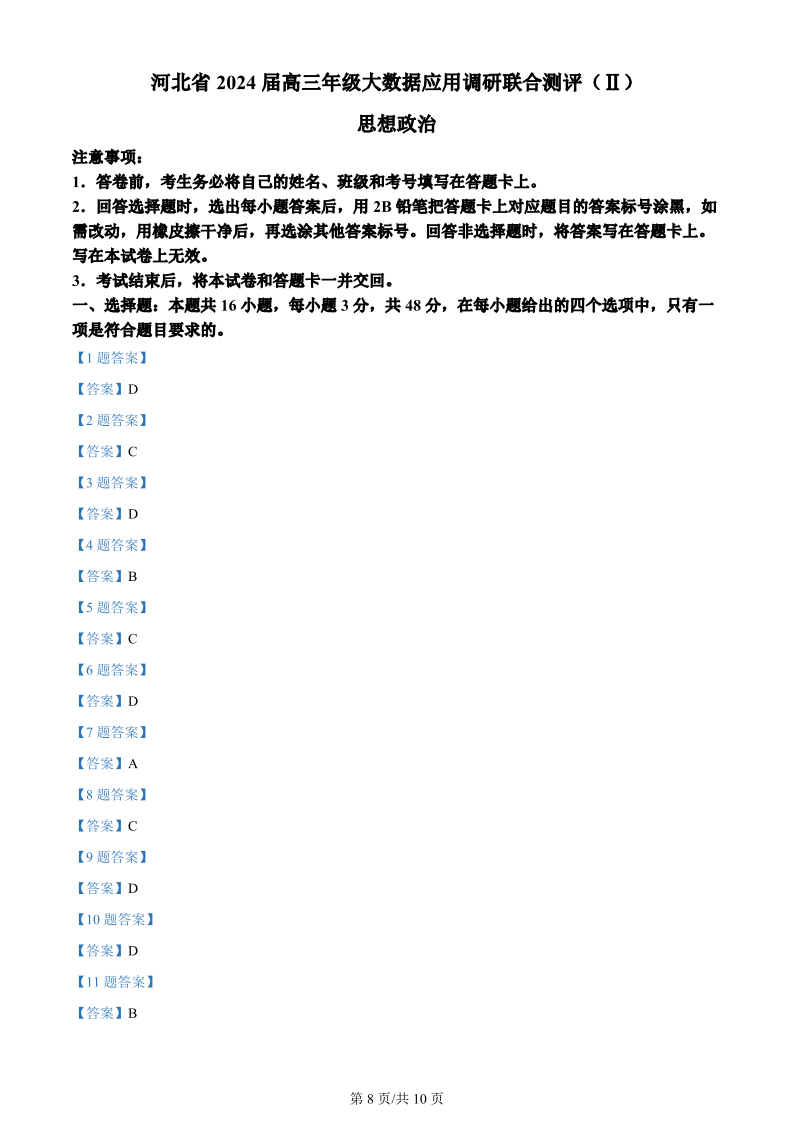 河北省2023-2024学年高三上学期大数据应用调研联合测评(Ⅱ)政治答案